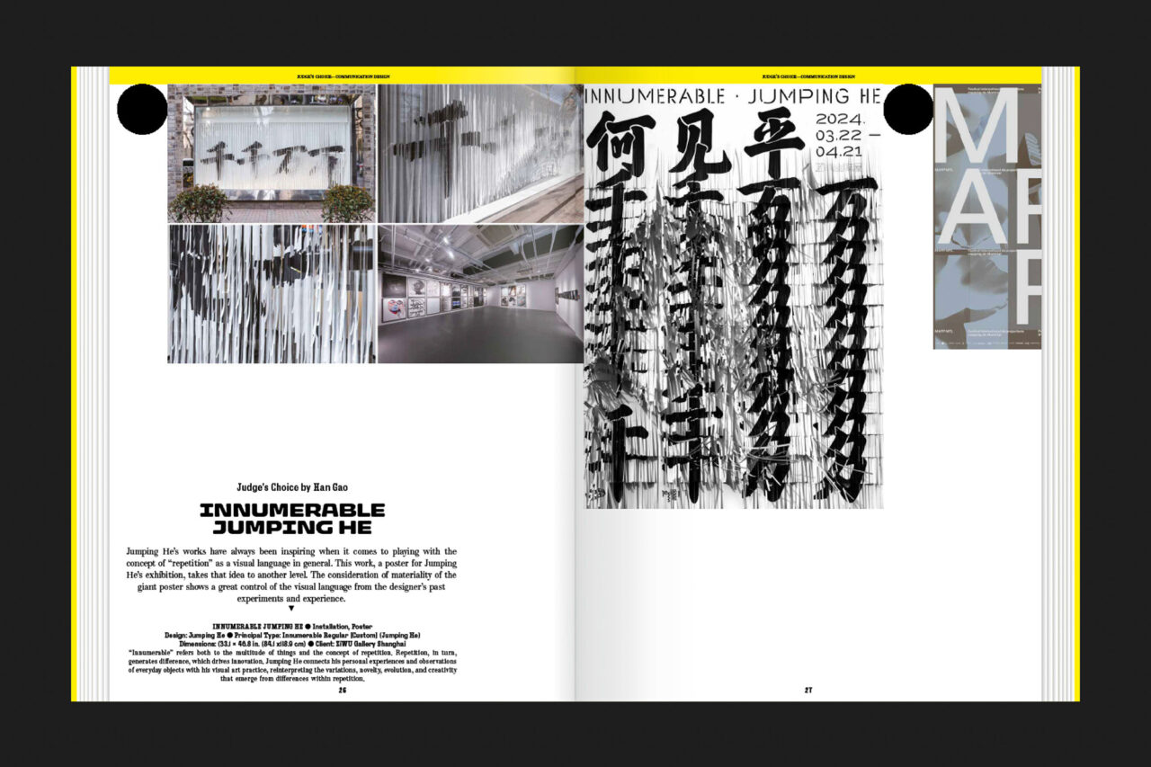 The book, printed by NINO Druck using a variety of Fedrigoni papers. Using three fonts by Polish type foundry Threedotstype, the book is highlights design work from three disciplines: Communication Design, Lettering Design and Type Design, along with a ‘Young Ones’ section that includes student winners. Each includes a ‘Judges’ Choices’ portion with the judges’ personal favourites.