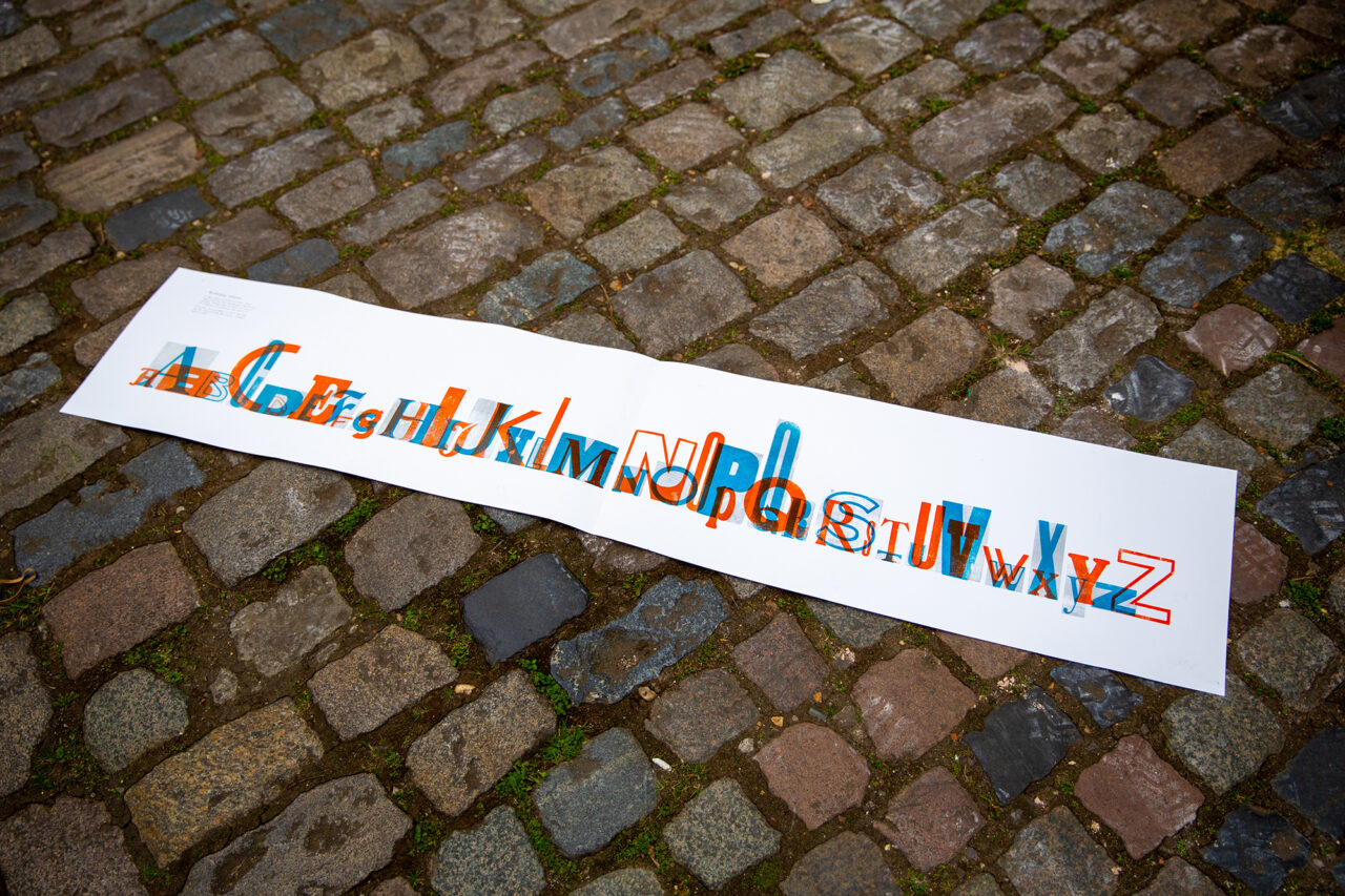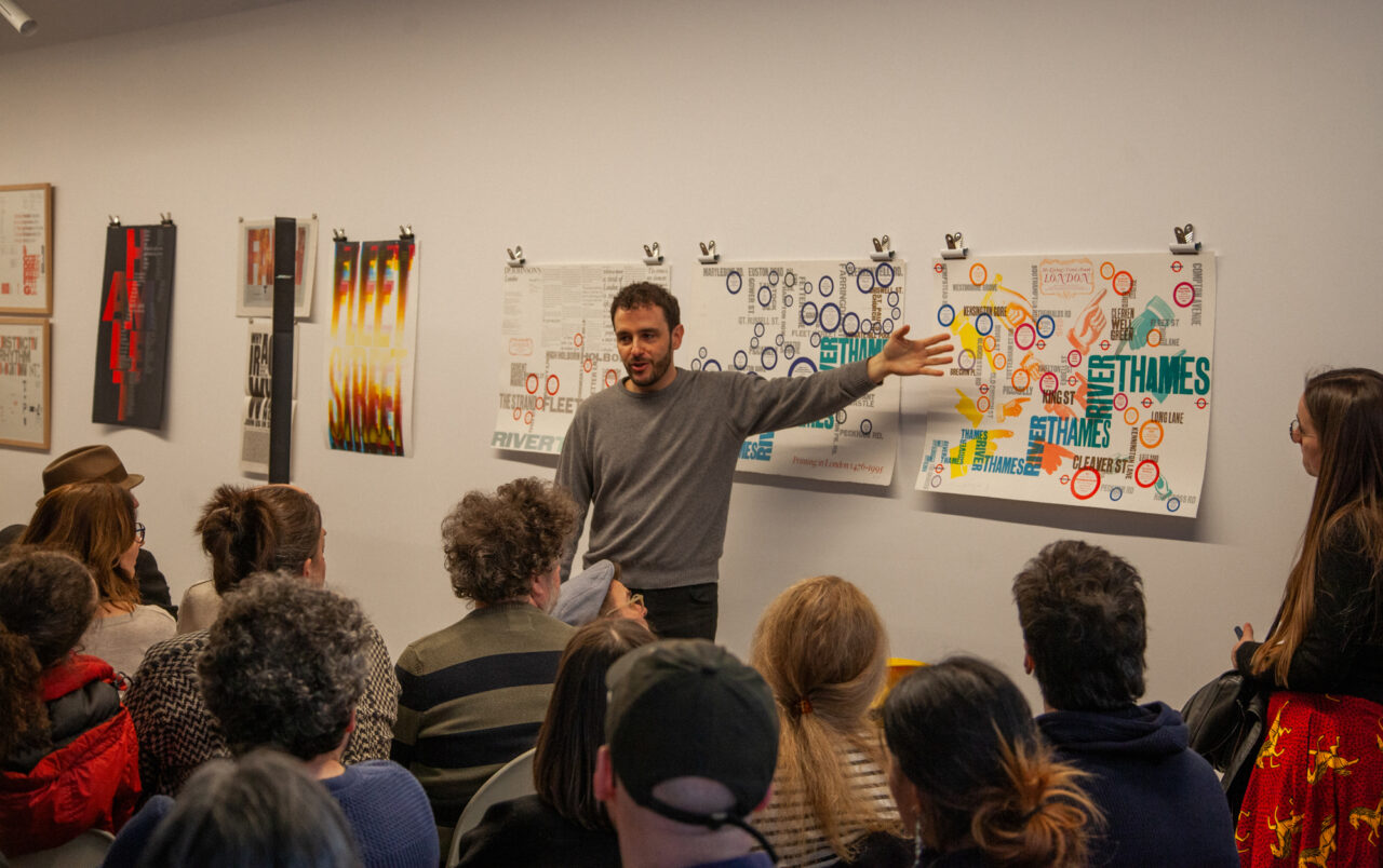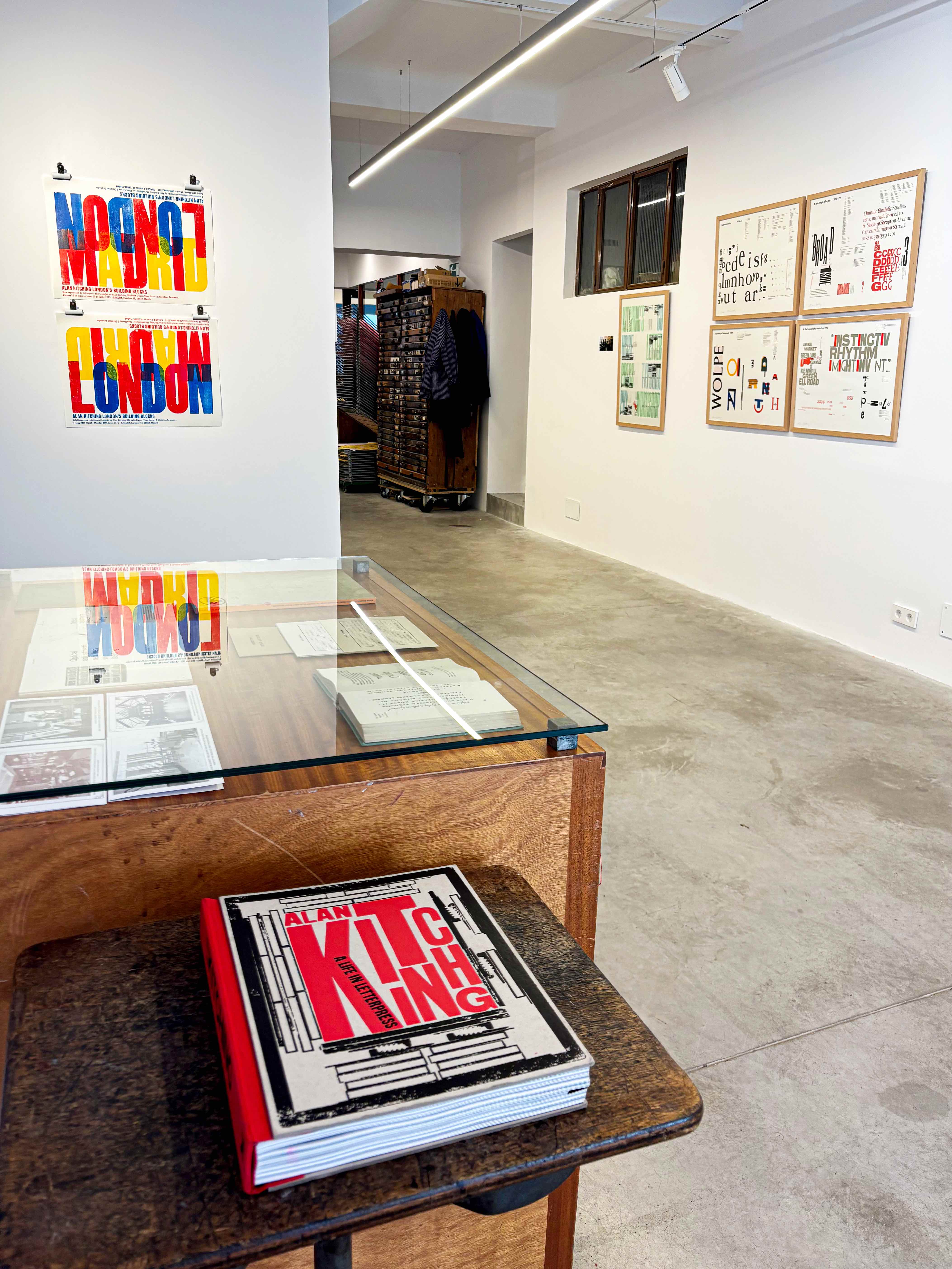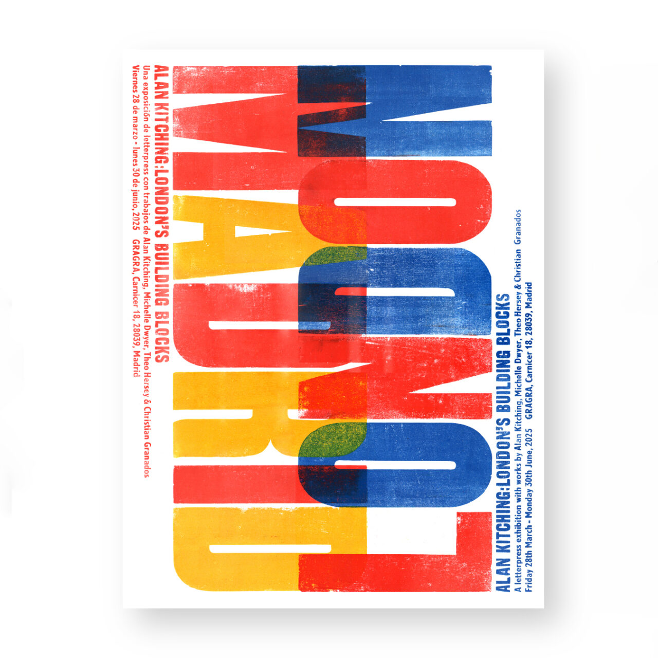 Alan Kitching: London’s Building Blocks runs at the GRAGRA gallery in Madrid until 30 June 2025. This exhibition features the work of three young letterpress designer-artists – Theo Hersey, Michelle Dwyer and Christian Granados – alongside that of their mentor and friend Alan Kitching (see ‘Mr Kitching in Italy’ in Pulp 6. Curated by journalist Andrés Oliva, the show kicked off in late March with a busy private view and a workshop – in which eight participants produced a limited-edition publication.