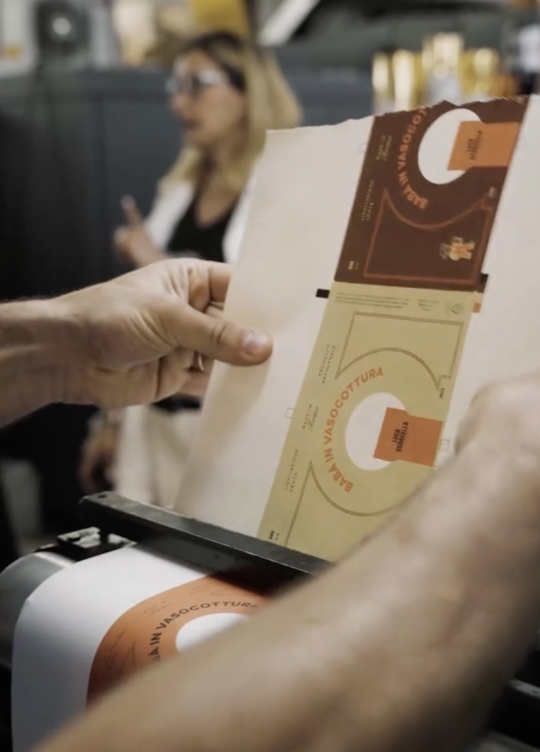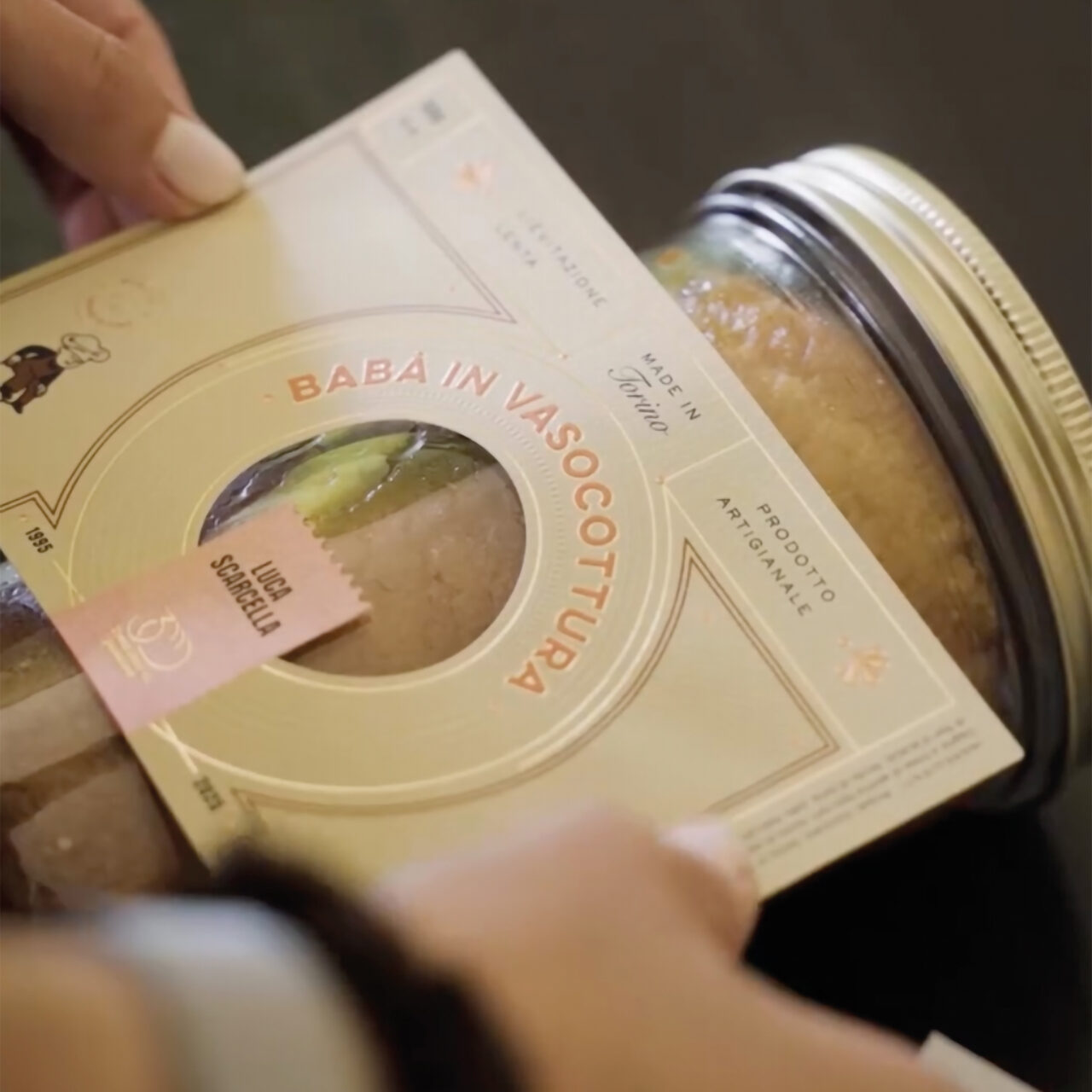 Il concorso incoraggiava sperimentazione e libertà creativa. Il concept di Tamborrino si ispira ai portoni storici di Torino, città di Scarcella, con le loro lavorazioni minuziose, e introduce un piccolo oblò al centro dell’etichetta, un invito alla curiosità e alla meraviglia. Ha inoltre impiegato la tecnologia HP Mosaic per dati variabili, rendendo ogni etichetta unica grazie a variazioni cromatiche e illustrazioni del “piccolo fornaio” (l’omino Scarcella) in pose diverse.